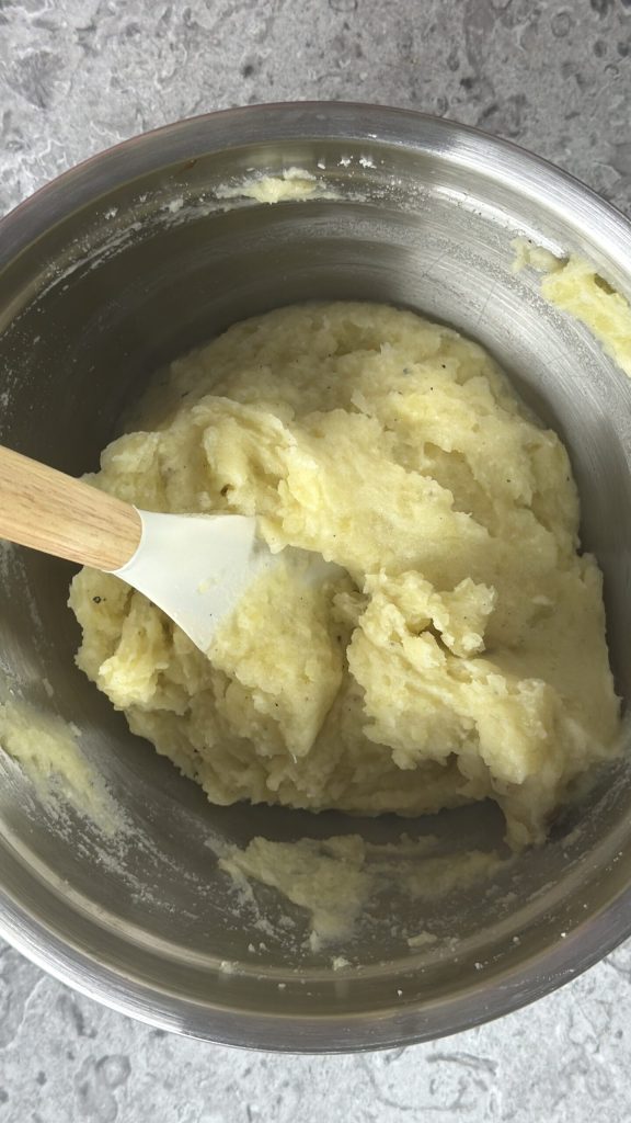 Zet de aardappelen in een pan op een klein pitje op zeer laag vuur, voeg de melk toe en roer met een garde tot deze is opgenomen; zet daarna het vuur uit en roer er boter en Parmigiano door tot een romige puree.
