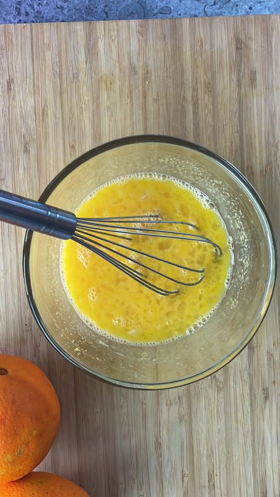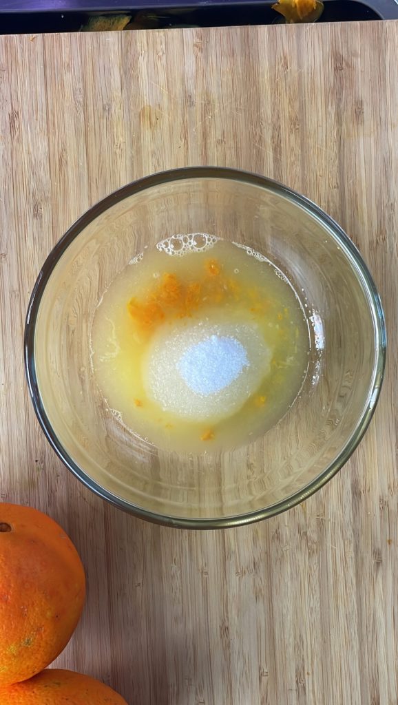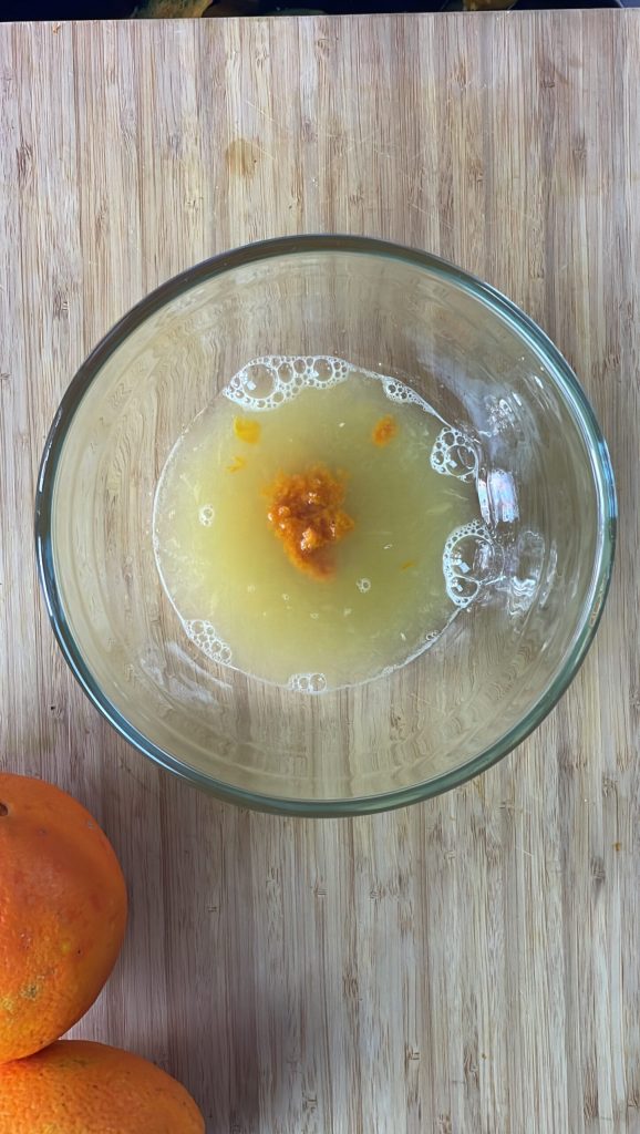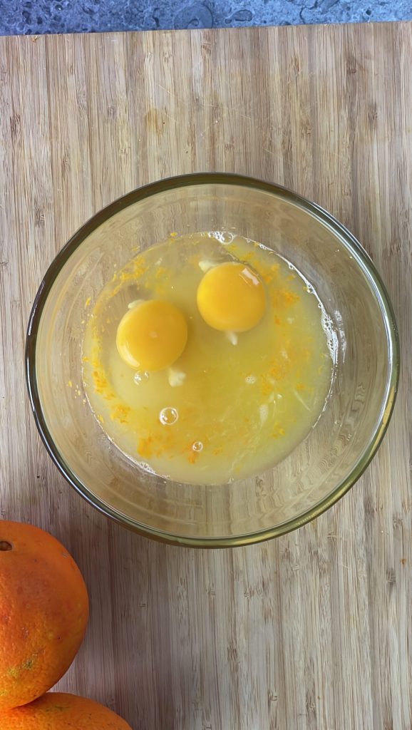 • Begin met de bereiding van de sinaasappelmousse – orange curd – door van één of twee onbespoten sinaasappels 80ml sap en twee eetlepels schil te verkrijgen.