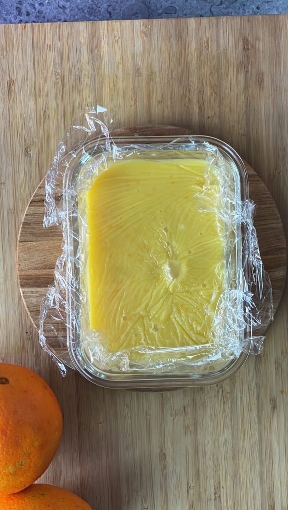 • Doe de sinaasappelmousse – orange curd – in een pot en bewaar hem in de koelkast.