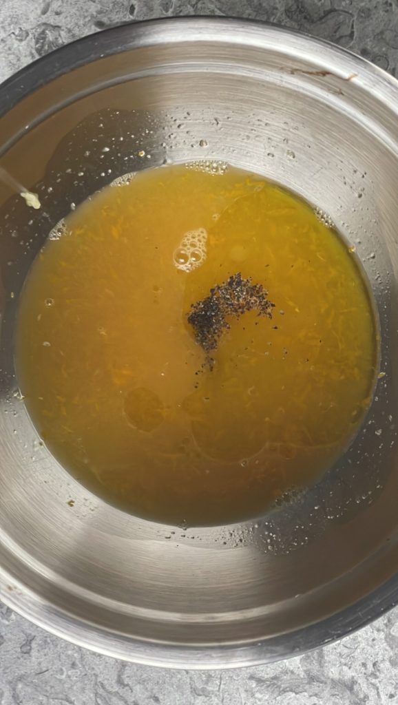 Ga verder met het sinaasappelsap, de extra vergine olijfolie, het zout en de zwarte peper.