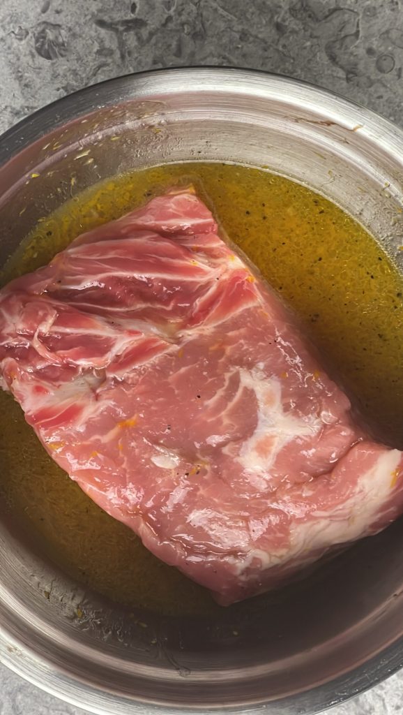Begin de bereiding van de varkenslende met sinaasappel met de dressing.