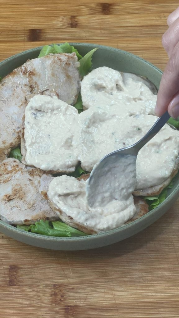 Blend tot je een gladde saus krijgt. Proef en voeg eventueel nog meer citroensap toe.Leg de plakjes varkenslende op een serveerschaal. Ik heb wat sla op de bodem gelegd, maar dat is optioneel.