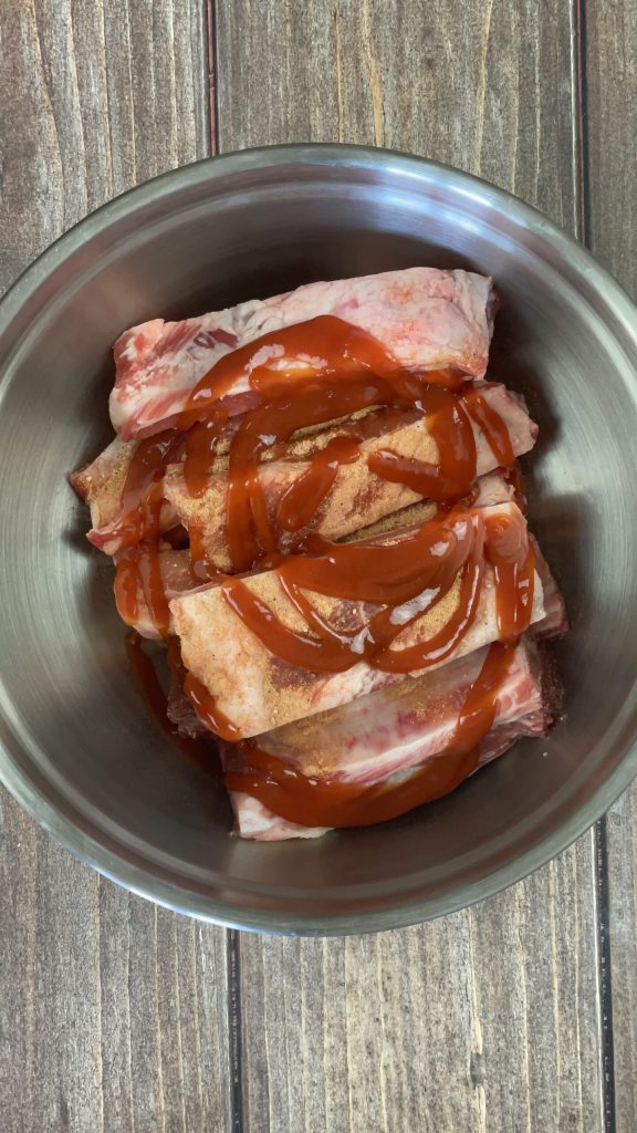 Voeg ook de ketchup en een kruidenmix naar keuze toe, ik heb mijn Zelfgemaakte barbecue rub gebruikt.Mix goed tot alle ribbetjes bedekt zijn met de marinade.