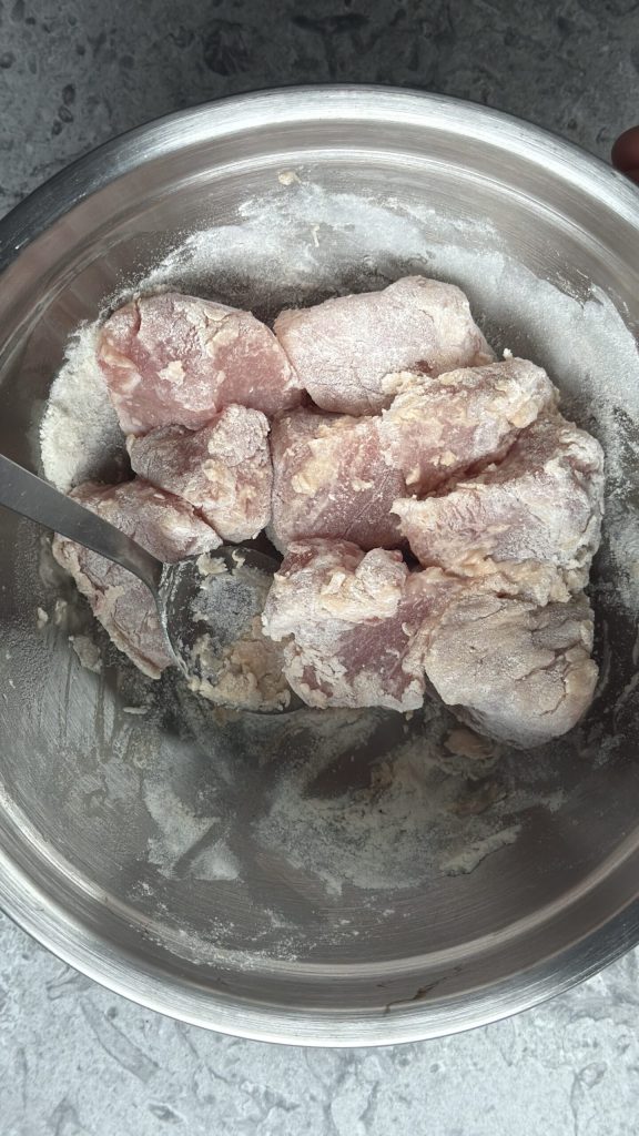 • Doe de varkensstoofpot in een kom, breng op smaak met zout en voeg de bloem 00 toe.