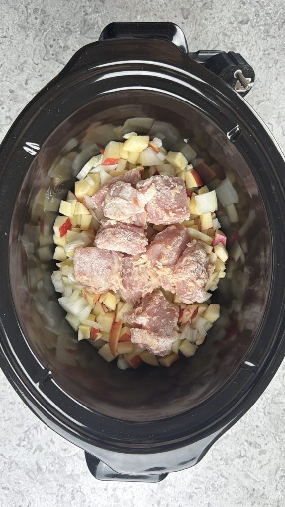 • Leg de stoofpot op de bodem van appels en uien en sluit de slowcooker af op lage temperatuur met het deksel.