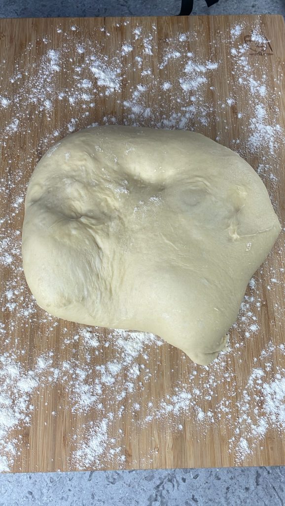 Kneed met de hand of in de keukenmachine met spiraalhaak op middellange snelheid tot het deeg is ingekapseld, dit duurt ongeveer 15 minuten.Werk het deeg op een bebloemd aanrecht in een ronde vorm en laat het rijzen bedekt in een ingevette kom tot het in volume is verdubbeld.
