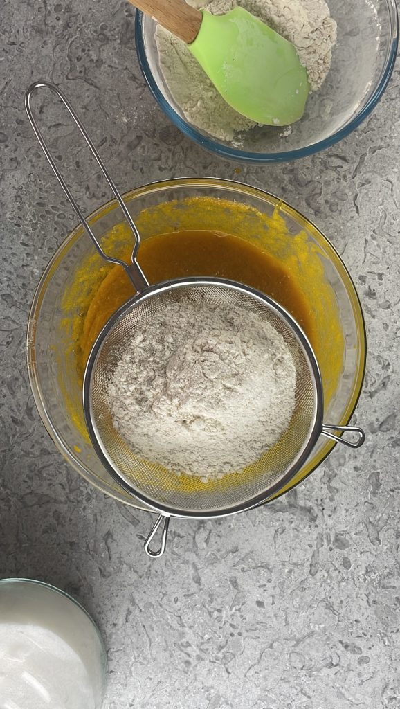 Zeef op dit punt de poeders in de kom met de natte ingrediënten.