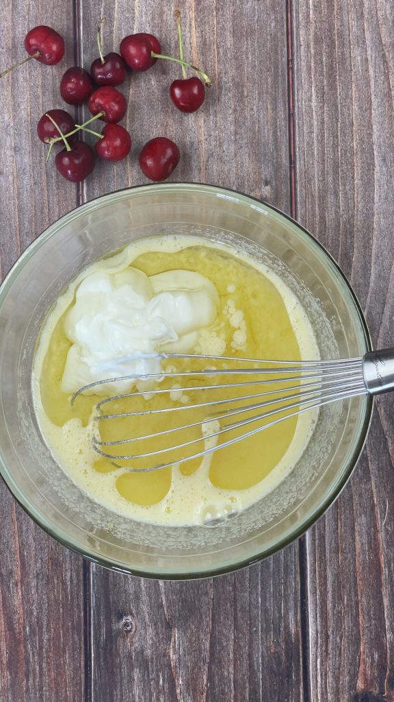 Klop de twee ingrediënten met de garde tot een schuimig mengsel.Voeg aan het mengsel een potje zonnebloemolie en de yoghurt toe: ik heb citroenyoghurt gebruikt en geen andere aroma’s toegevoegd, als je naturel yoghurt gebruikt kun je wat citroenrasp en/of vanille-extract toevoegen.