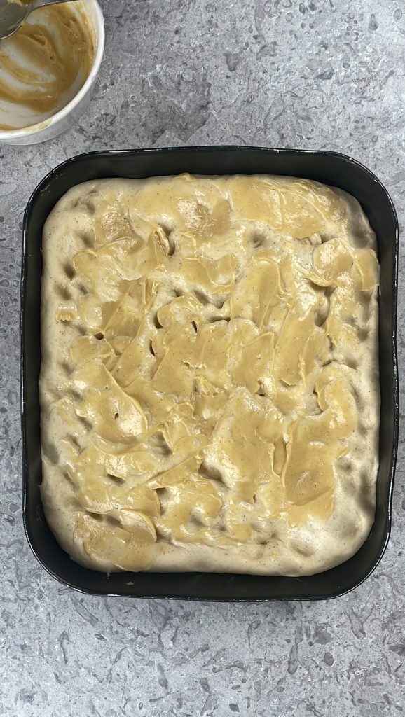 Nadat de rijstijd is verstreken, rol je het focaccia-deeg direct uit op de bakplaat, voeg de botercrème toe en verdeel deze met een spatel.