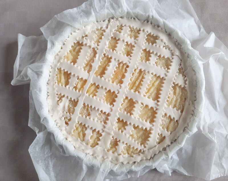 • Snijd met het overtollige bladerdeeg reepjes met de specifieke deegsnijder en leg ze op de taart alsof het een rooster is.