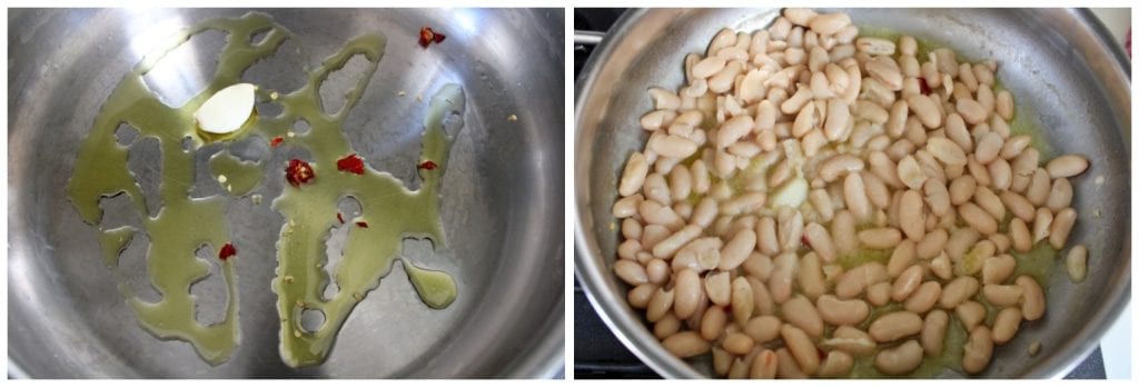 • Verhit ondertussen in een pan de extra vergine olijfolie en fruit hierin het teentje knoflook en de chilipeper (als je dat lekker vindt), voeg dan de voorgekookte cannellinibonen toe en 2 pollepels kookvocht van de andijvie. Breng op smaak met zout, meng en laat een paar minuten (ongeveer 5-7 minuten) op smaak komen.