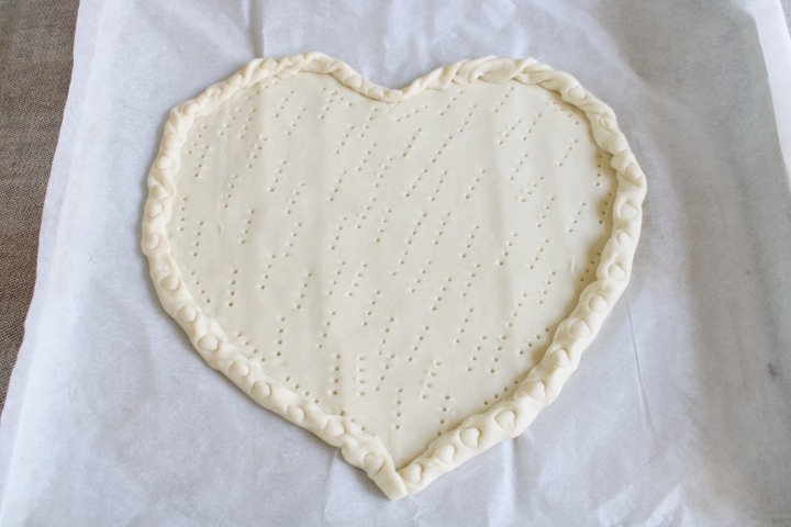 Haal het bladerdeeg uit de koelkast en laat het minstens 5 minuten op kamertemperatuur staan, rol het vervolgens uit. Snijd met een mes (of een pizzasnijder) de vorm van een hart uit, snijd vervolgens extern een rand van ongeveer 3 cm af en rol deze op, knijp het met de vingers samen.