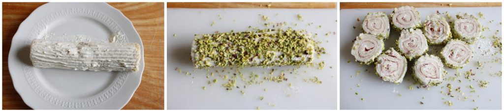 Voor het serveren, bedek je de bovenkant van de rolletjes met meer smeerbare kaas, rol ze in de pistachenootjes, snijd ze in plakjes en serveer.