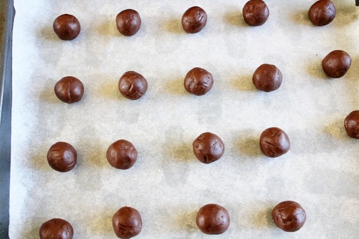 Neem stukjes deeg ter grootte van een walnoot (bij voorkeur van dezelfde grootte; als je dat wilt, kun je ze van tevoren wegen), rol ze met je handen en plaats ze, één voor één, op de met bakpapier beklede bakplaat.
