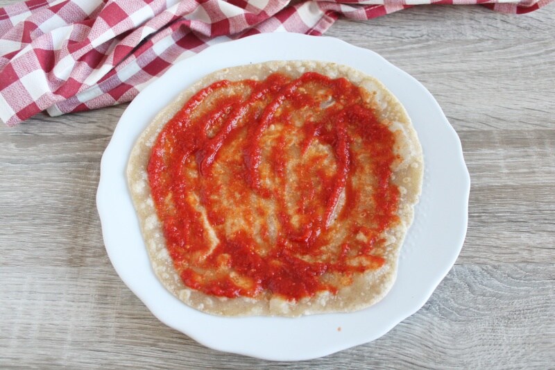 Leg de piadina op een snijplank of op een plat bord. Smeer de gekruide tomatensaus over de hele oppervlakte van de piadina (of alleen over de helft), laat een rand van ongeveer 1 cm vrij.