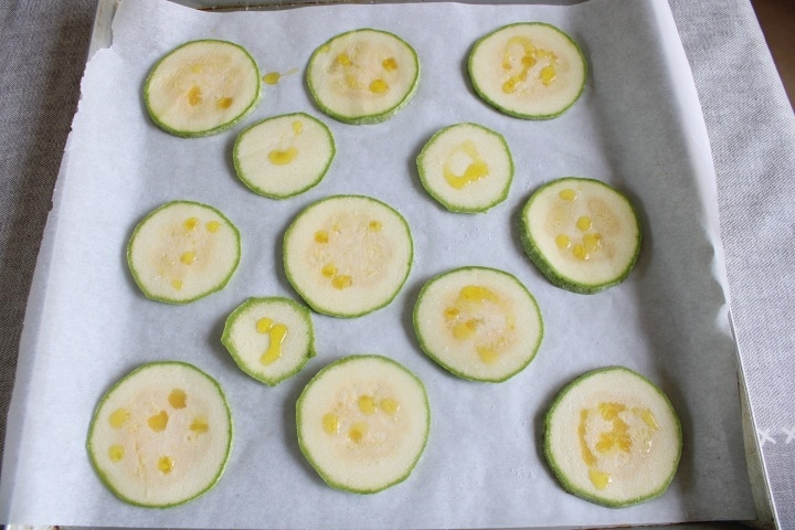 • Was eerst de courgettes en snijd de uiteinden eraf; snijd ze in plakjes van ongeveer 0,3 – 0,5 cm (ze moeten vrij dun zijn) met een mandoline, plaats ze op een bakplaat bekleed met bakpapier en besprenkel ze met een beetje olie, een beetje zout en peper. Bak in een voorverwarmde oven gedurende ongeveer 8 – 9 minuten (afhankelijk van de dikte).