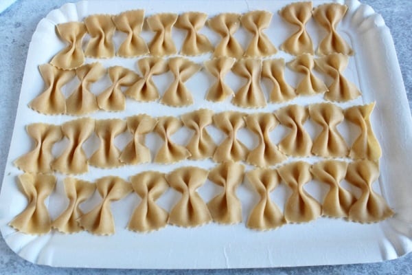 Leg de farfalle op papieren schalen of op de deegplank en laat ze even rusten, gescheiden van elkaar.