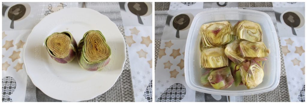 • Maak eerst de artisjokken schoon. Verwijder de stengels van de artisjokken, verwijder de buitenste bladeren, die harder zijn. Snijd de overgebleven bladeren af, verwijder het binnenste hooi met de punt van een mes en snijd ze in dunne plakjes (ongeveer 0,5 – 0,7 cm dik).