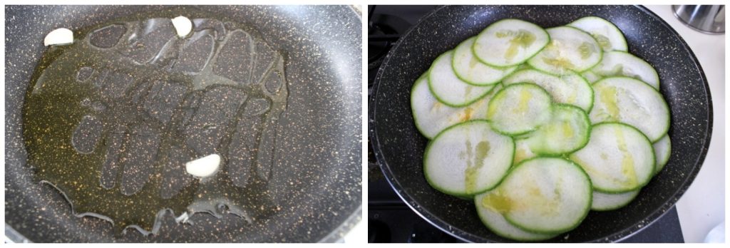 Verhit in een grote pan de extra vergine olijfolie samen met een teentje knoflook, leg de courgettes (niet allemaal tegelijk, maar beetje bij beetje) en laat ze ongeveer 2 – 3 minuten koken, draai ze voorzichtig om met een keukenspatel. Omdat ze dun zijn, duurt het niet lang.