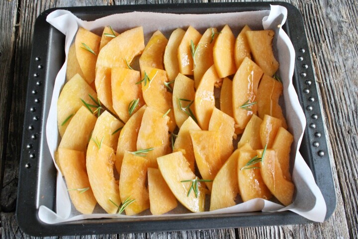 Bedek een bakplaat met bakpapier en plaats de pompoenplakken licht overlappend op de plaat; besprenkel ze met een beetje extra vergine olijfolie, voeg de rozemarijn toe en zout naar smaak. Bedek de bakplaat met aluminiumfolie en bak in een voorverwarmde oven op 185°C voor ongeveer 30 – 35 minuten: de pompoen moet gaar zijn. Controleer de gaarheid voordat je de oven opent.