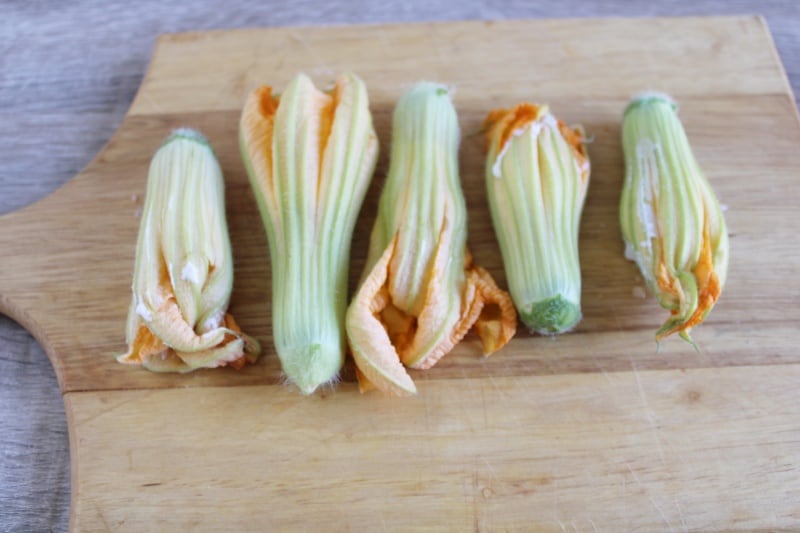 Maak eerst voorzichtig de courgettebloemen schoon. Open elke bloem en verwijder voorzichtig de stamper erin, zorg ervoor dat je ze niet breekt (ik gebruikte een keukentang).