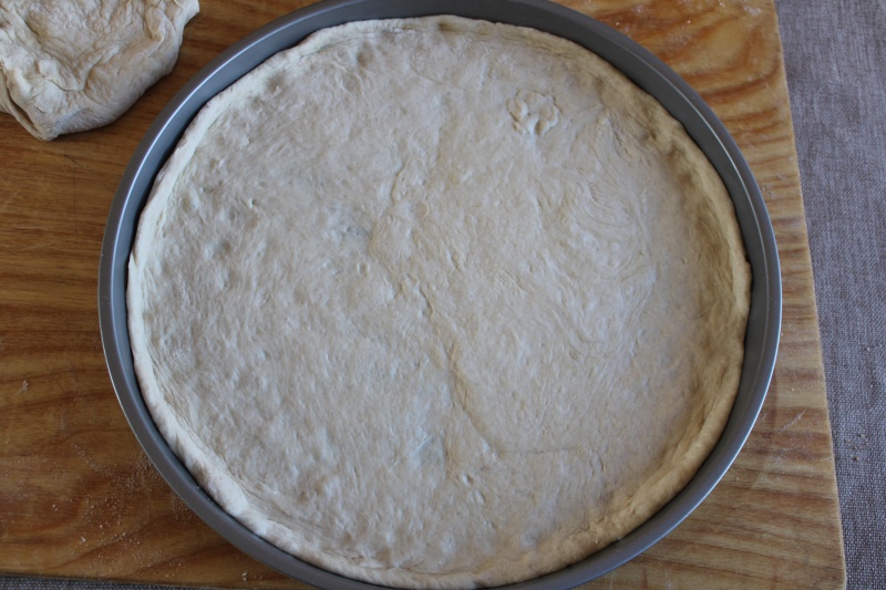 Kleine tip: als het deeg erg elastisch is en ’terugtrekt’ terwijl je het uitrolt, laat het dan 5 minuten rusten in de bakvorm en ga dan verder. De gluten zullen ontspannen en het uitrollen wordt veel eenvoudiger.