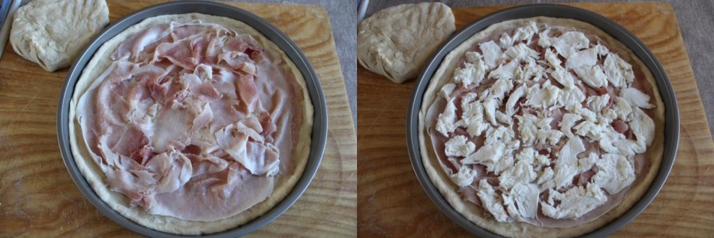 Verdeel op dit punt de plakjes gekookte ham gelijkmatig over de bodem en voeg vervolgens de mozzarella toe, die je eerder hebt gesneden en goed hebt uitgelekt, waarbij je een centimeter vanaf de rand vrijlaat.