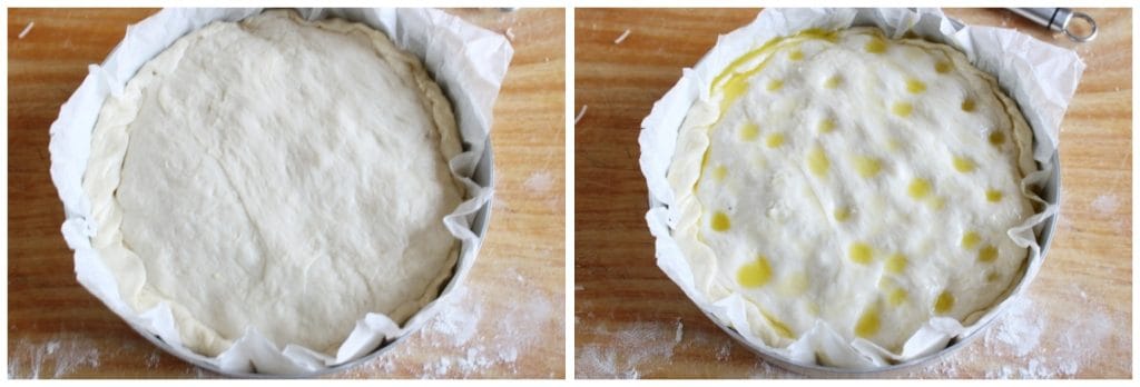Eenmaal gerezen, bekleed een bakplaat of een ovenschaal van ongeveer 28-30 cm diameter met geolied bakpapier, verdeel dan het deeg in 2 delen en rol een van de 2 delen direct in de ovenschaal uit, uitrekkend met de handen.