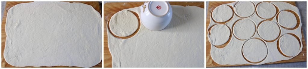 Rol het deeg daarna uit met een deegroller tot een zeer dunne laag van maximaal een halve centimeter, en gebruik een ronde uitsteker (ik heb een kopje gebruikt) om cirkels uit te steken.