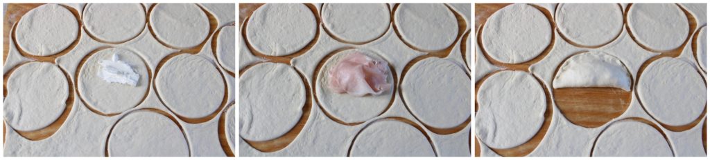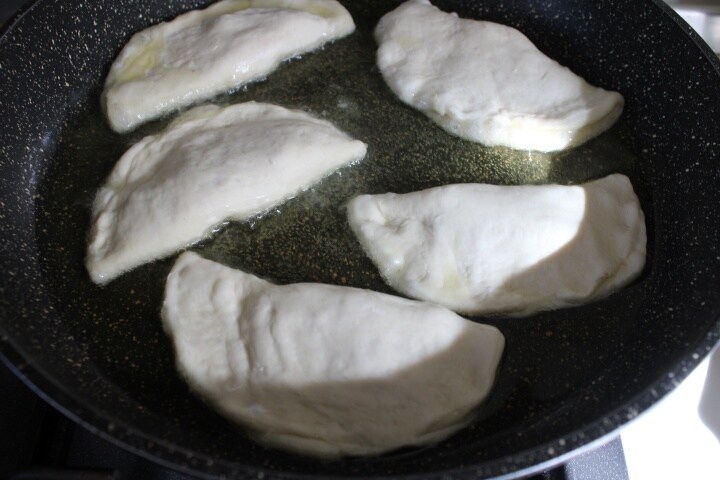 De bereiding is heel eenvoudig en snel. Het is eigenlijk een gerezen deeg, dat van het pizzadeeg, dat laat je rijzen tot het verdubbeld is en dan snijd je het in ruiten (of in mijn geval, in cirkels die gevuld worden) en frituur je ze.