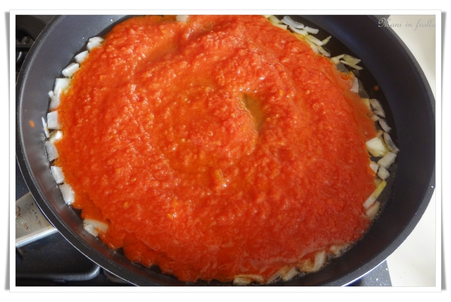 Allereerst, laat de mozzarella uitlekken in een vergiet. Hak vervolgens de ui fijn en doe deze samen met 3 eetlepels extra vergine olijfolie en de knoflook in een koekenpan. Voeg dan de tomatenpassata toe. Kook de saus op matig vuur gedurende 20/25 minuten, let erop dat deze niet te veel indikt.