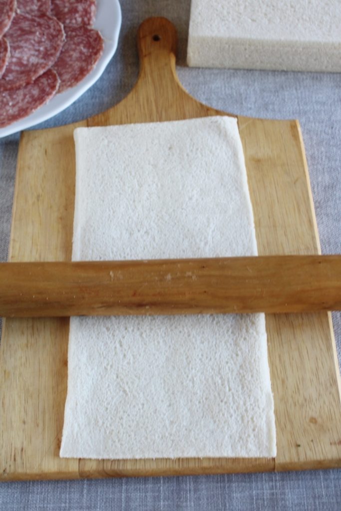 Trek eerst voorzichtig de plakjes brood uit de verpakking. Leg er een op de snijplank en druk goed aan met de deegroller, verdeel het dan in 3 gelijke delen in de lengterichting.