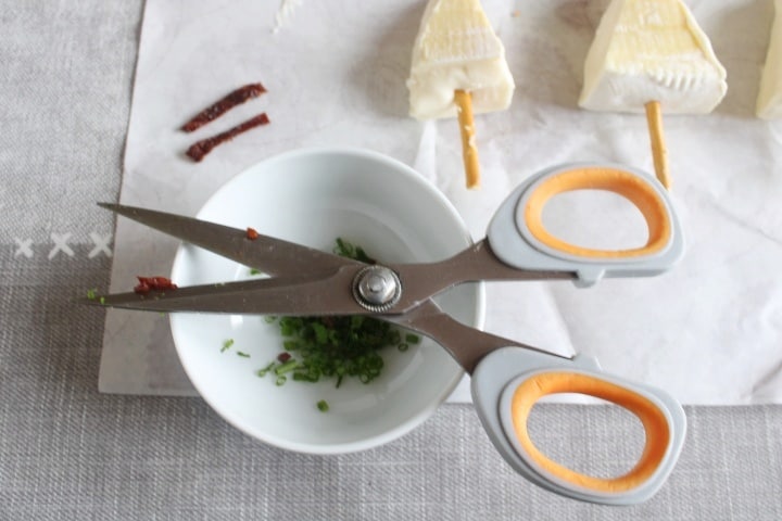 Ondertussen, knip met een schaar de bieslook (ongeveer 5 – 6 stengels) en de gedroogde tomaten (1 als deze groot is) in stukjes, doe ze in een kommetje en meng goed. Als je wilt, kun je ook een snufje rode peper toevoegen (als je dat lekker vindt).