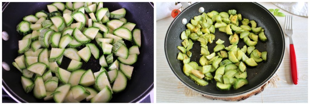 Was eerst de courgettes, verwijder de uiteinden en snijd ze in stukjes. Verhit de extra vergine olijfolie in een koekenpan samen met het teentje knoflook, voeg dan de courgettes toe en laat ze ongeveer 10 minuten op laag vuur bakken: ze moeten zacht worden, maar stevig blijven.