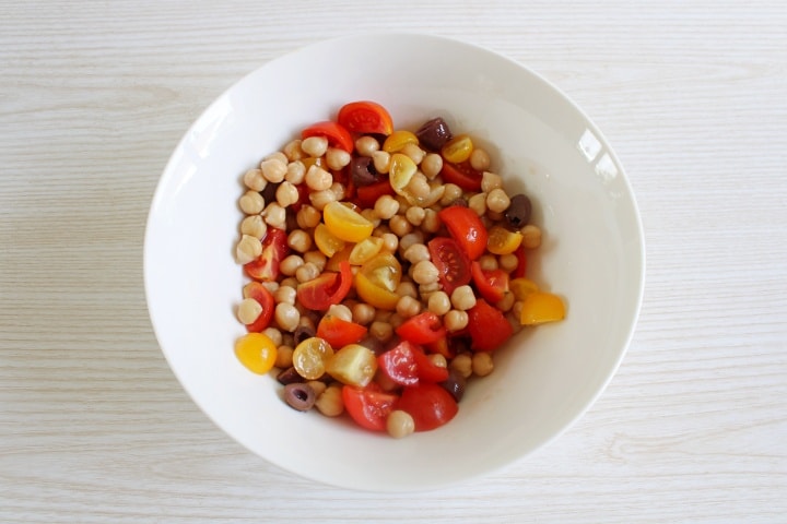 Was ondertussen ook de cherrytomaten en snijd ze doormidden en in partjes, spoel dan de kikkererwten af onder koud water, laat ze goed uitlekken en doe ze in een kom, samen met de cherrytomaten.