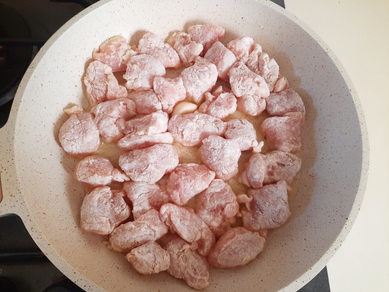 Verhit vervolgens in een ruime pan op middelhoog vuur 3-4 eetlepels olijfolie met de teen knoflook. Voeg de kipblokjes toe als het warm is.