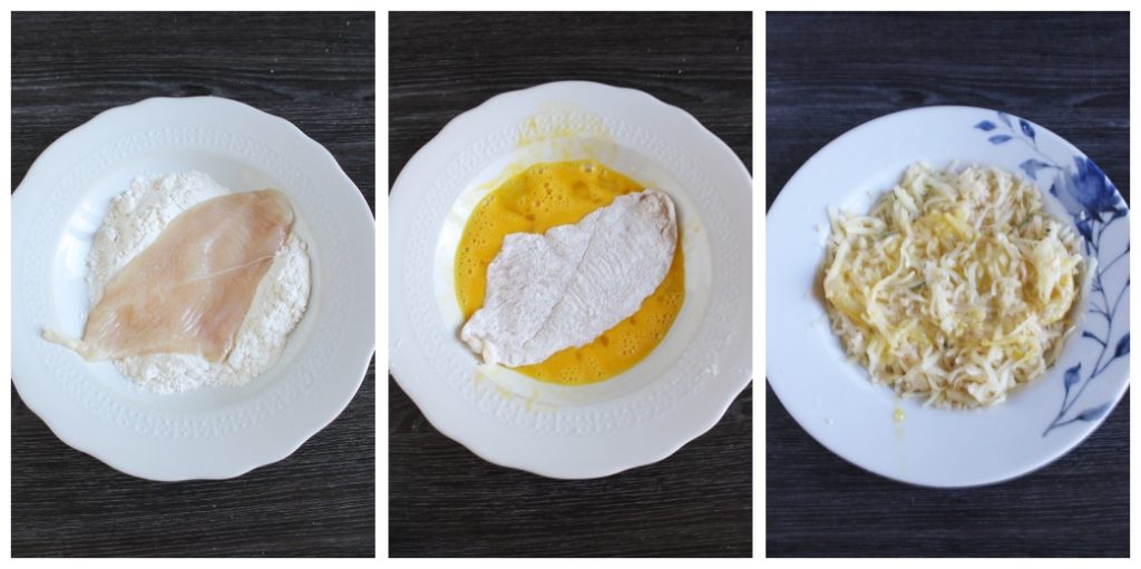 • Neem de kipfilets, haal ze eerst door de bloem, dan door het ei en vervolgens door de aardappelen, druk ze goed aan.
