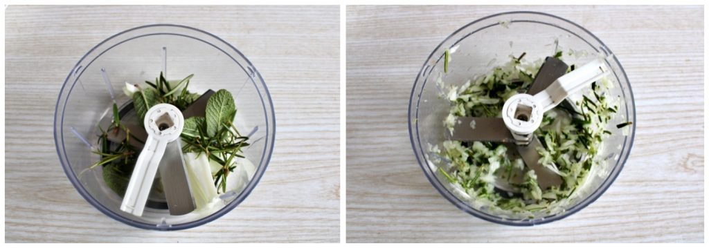 Schil allereerst de ui en hak deze fijn met een handmatige hakmolen samen met de blaadjes salie en de naalden van rozemarijn en tijm.