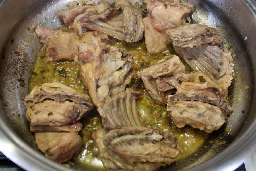 Het is eenvoudig en snel te bereiden. Allereerst heb ik een mengsel gemaakt van ui, salie, rozemarijn en tijm, dat ik in een pan met extra vierge olijfolie heb gebakken. Vervolgens heb ik het in stukken gesneden konijn toegevoegd, het goed rondom bruin gebakken en uiteindelijk afgemaakt met een flinke scheut witte wijn. Op dit punt heb ik de pan afgedekt en het zachtjes laten stoven gedurende ongeveer 70 minuten, totdat het mals en goed gaar was.