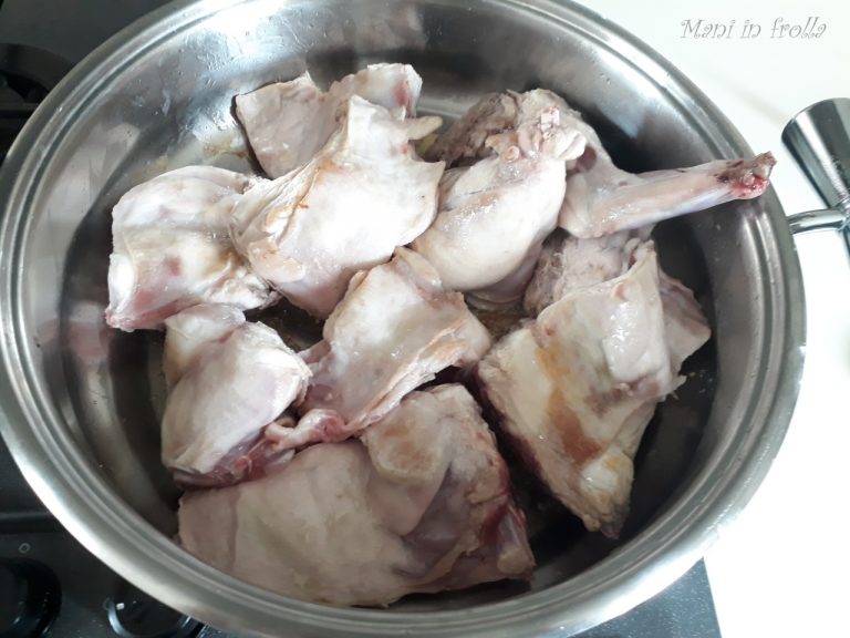 Was eerst het konijn en dep het droog met keukenpapier. Giet in een geschikte pan de olie met de gepelde knoflook en laat het 1-2 minuten smaken zonder het te verbranden. Vervolgens, laat bakken de gehakte ui en de stukken konijn in de pan, totdat ze mooi goudbruin zijn: dit duurt ongeveer 5 minuten. Let op dat je het vlees niet doorboort.