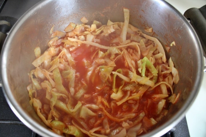 Verwijder vervolgens de knoflook en voeg de in reepjes gesneden kool toe, laat een minuutje smaken terwijl je roert, voeg dan de tomatensaus toe; dek af met een deksel en laat 20 minuten op laag vuur koken.