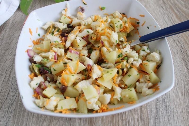 in een pan bedekt met water, gedurende ongeveer 8-10 minuten, of totdat ze zacht maar nog stevig zijn. Laat ze uitlekken en afkoelen.In een grote schaal, combineer de verkruimelde koolvis, de afgekoelde aardappelblokjes, de olijven, de fijn gesneden ui, de bleekselderij en de wortelen in julienne gesneden (ik heb de Moulinex slicerrasp gebruikt).