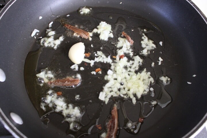 Verhit eerst in een voldoende grote pan 3 eetlepels extra vergine olijfolie, voeg de ui en 1/2 fijngehakte teentje knoflook toe met een handmatige hakmolen (handig en snel) en laat ze goudbruin worden gedurende een paar minuten samen met een heel teentje knoflook, voeg vervolgens de ansjovis toe (druk ze beetje bij beetje met een houten lepel om ze op te lossen), de kappertjes en een snufje chilipoeder en laat het lichtjes bakken gedurende ongeveer 2 – 3 minuten.
