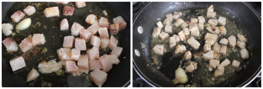 Maak de zwaardvis schoon, verwijder de huid, snijd hem in blokjes en voeg toe aan de pan met de gebakken ingrediënten, laat het bruinen gedurende 1-2 minuten, voeg vervolgens de witte wijn toe en laat het verdampen.