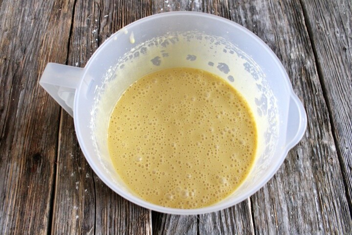 Klop eerst het ei in een ruime kom, voeg de eierdooier en de suiker toe en klop met de elektrische mixer. Voeg dan ook de olie in een dunne straal toe, terwijl je blijft kloppen.