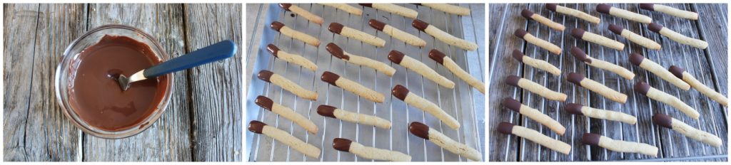Smelt ondertussen de pure chocolade in een kom; doop de punt van de afgekoelde koekjes en laat ze rusten op een rooster voor een paar uur.