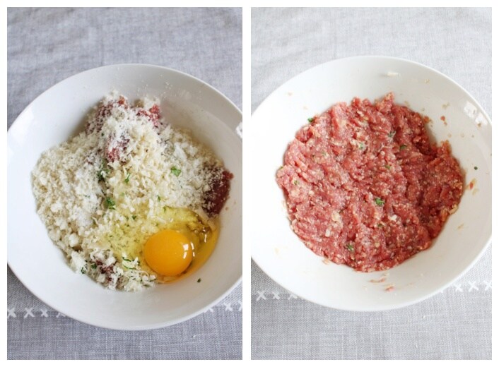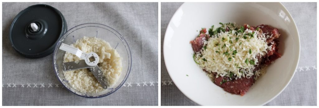Doe eerst het gehakt in een grote kom. Verkruimel het oude brood in een handmatige hakmolen, voeg het dan toe aan het vlees samen met de geraspte Parmezaanse kaas, de peterselie en de gepelde en gehakte knoflook. Voeg zout en peper naar smaak toe.