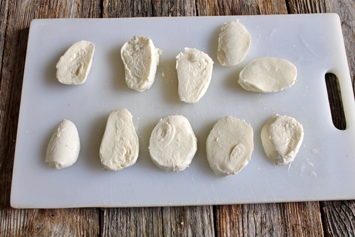 Allereerst, laat de mozzarella’s uitlekken in een vergiet, daarna droog ze af met keukenpapier en snijd ze in plakken van ongeveer 1,5 cm – 2 dikte.