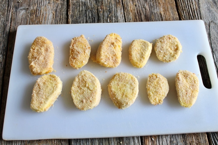 Ondertussen, klop de eieren in een bord met zout en peper. Als je dat wilt, kun je ook gedroogde tijm of andere kruiden toevoegen. Droog op dit punt de mozzarellaplakken goed af, doe ze voorzichtig in het geklopte ei, daarna in het paneermeel en opnieuw in het ei en tot slot, in het paneermeel: maak een dubbele paneerlaag.