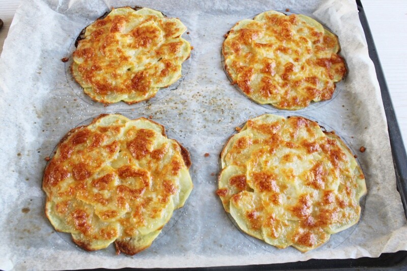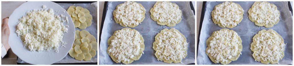 Bedek een bakplaat met bakpapier, teken 4 cirkels van ongeveer 15 cm (ik gebruikte een deksel voor meer precisie, maar het is niet noodzakelijk). Plaats de aardappelplakjes op de bakplaat, lichtjes overlappend om een cirkel te vormen.